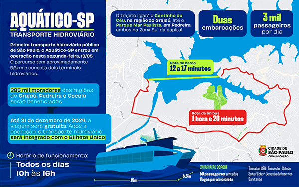 Além de proporcionar maior agilidade e rapidez nos deslocamentos, o Aquático-SP terá integração completa com o transporte por ônibus, utilizando o Bilhete Único, e a inauguração de duas novas linhas, melhorando a mobilidade na região.